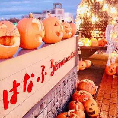 잭오랜턴 형태의 호박 조형물들과 에니와시의 특산물인 “에비스 호박”을