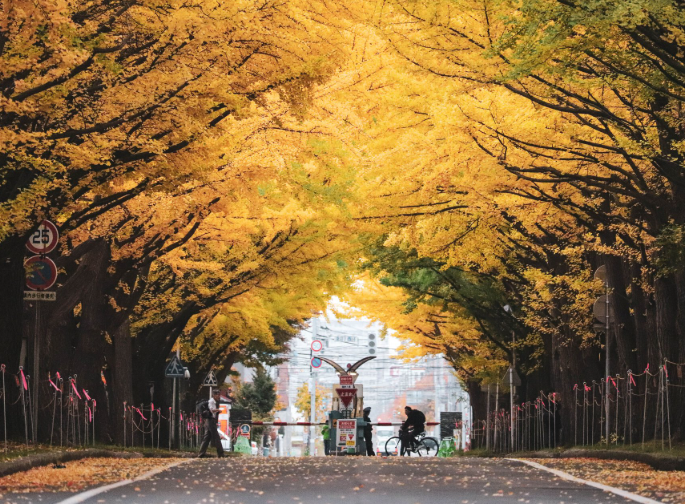 홋카이도대학 북문 근처에서 오노이케 연못까지 이어지는 약 400m의 가로수길로 아름다운 단풍을 즐길 수 있답니다.🍂