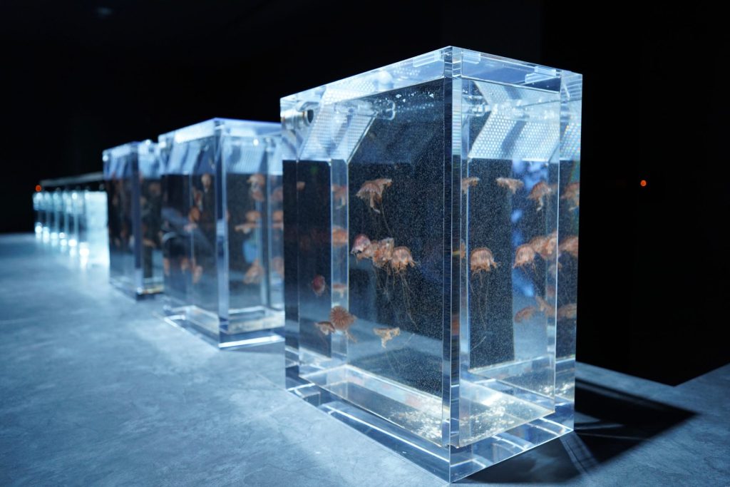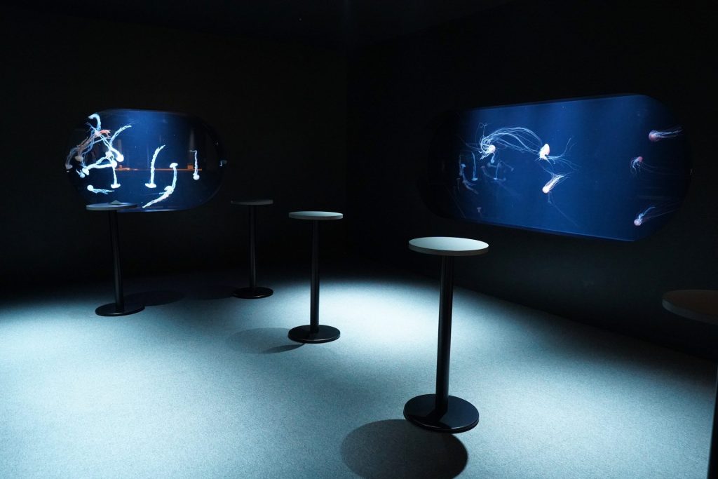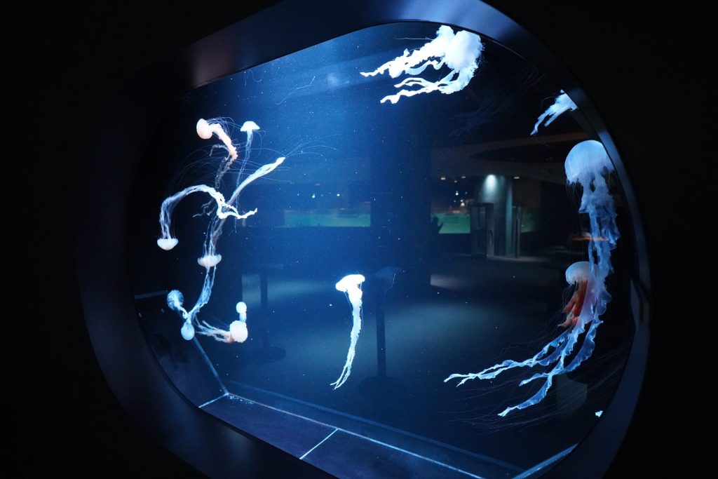 어두운 조명과 대비되어 밝게 빛나는 해파리들은