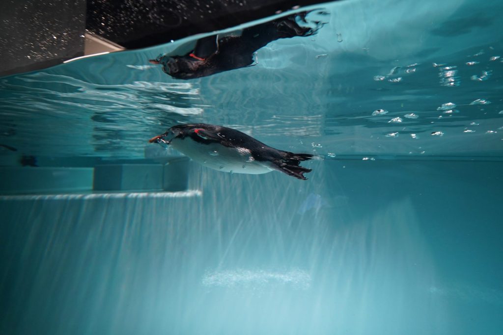 노랗고 긴 눈썹처럼 보이는 깃털이 특징인 북부바위뛰기펭귄과