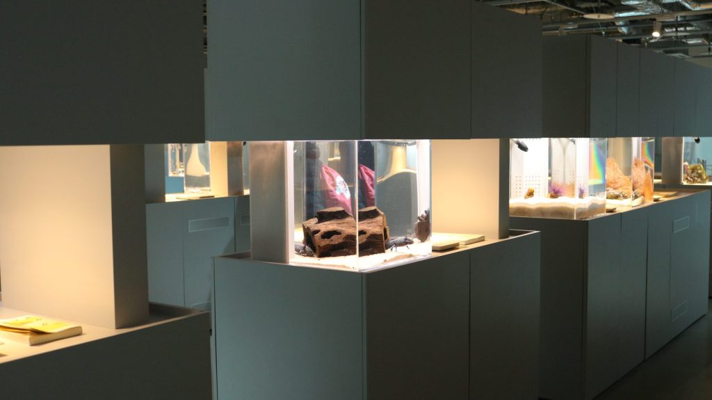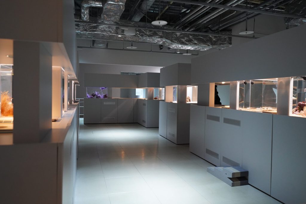 생물의 특징과 매력에 맞춰 도서관처럼 분별한 수조와 책(LIBRARY AQUARIUM)이