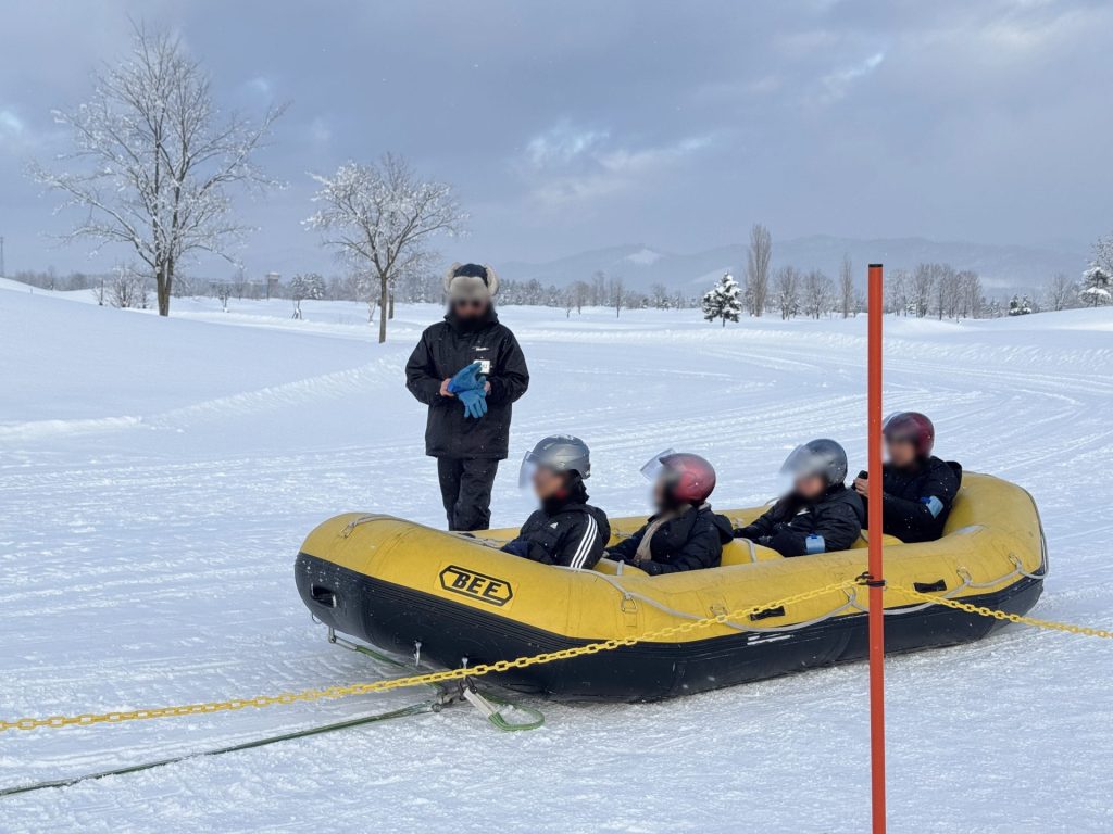 대형 스노우모빌에 연결된 고무보트를 타고 설원을 빠르게 질주하는 액티비티로,