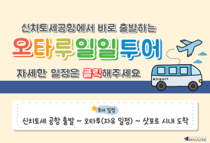 안녕하세요.홋카이도 매거진입니다. 👆🏻첫날부터 알차게! 강력 추천 오타루 일일 투어 위의 RESERVATION 버튼을 누르면 예약페이지로 이동합니다 삿포로 여행, 이렇게 시작해보세요! *본 투어는 10월 1일부터 운행합니다.* 신치토세 공항 도착 후, 번거롭게 환승하지 않고 바로 오타루까지 전용 버스로 편하게 이동!오타루에서의 자유 시간까지 즐기고, 삿포로로 돌아오는 알찬 일일투어입니다.삿포로 여행 첫째 날에 추천하는 투어에요🩵(신치토세공항in 삿포로out) *본 투어는 지금 바로 예약 가능합니다!!* 홋카이도에서 쓸 수 있는 알찬 혜택까지!😍여행도 즐기고 할인도 받고,기억에 오래 남을 홋카이도 여행을 경험해 보세요:)♥ 오타루는 홋카이도 여행에서 빼놓을 수 없는 인기 코스지만,기차 환승이 번거롭고 짐도 들고 다녀야 하죠.이 투어는 공항에서 짐 걱정 없이 버스에 실고,편하게 오타루로 이동할 수 있어 첫날 일정으로 딱 좋은 구성이에요.지금 바로 자세히 소개해 드릴게요! 신치토세 공항*승차* – 오타루 –