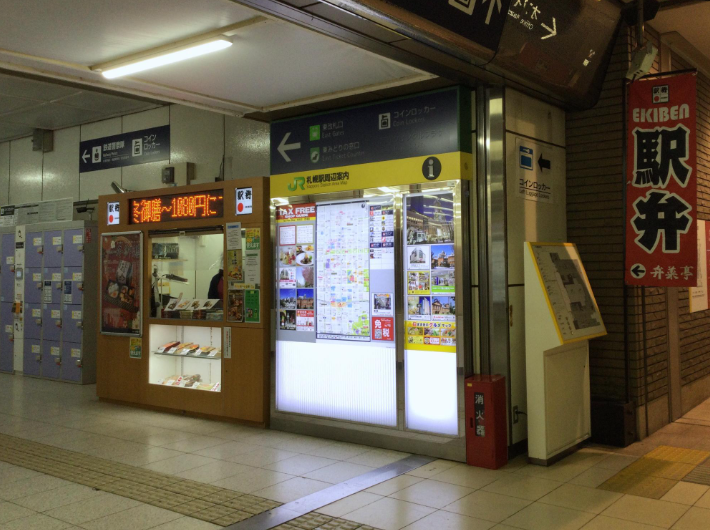 에키벤 상점은 동쪽 출구 개찰구 앞, 서쪽 출구 옆 동전 보관함과 기념품 가게 근처에 있어요