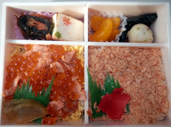 구성 : 구운 연어, 소고기 조림, 계란말이, 조개나 홋카이도 재료 등