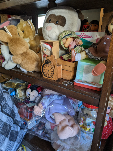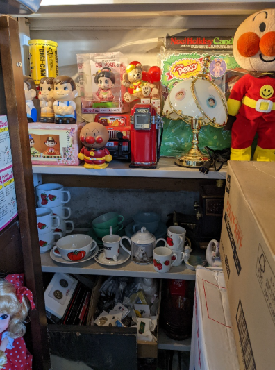 선반마다 컵,인형, 브로치,틴 케이스 등 빼곡히 소품들이 진열되어 있어 구경하는 재미가 있답니다